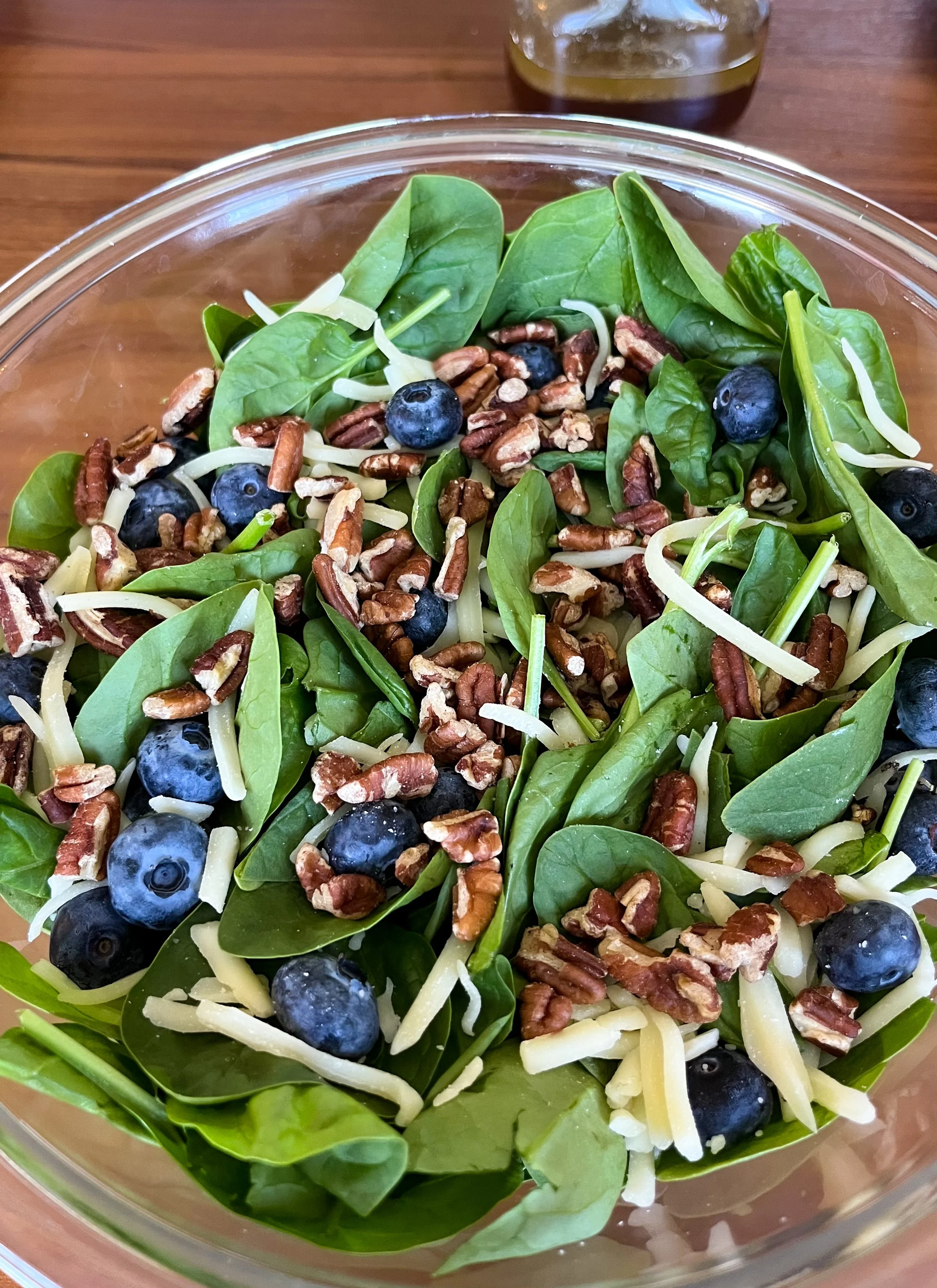 Mix dressing ingredients in a small bowl or mason jar. Toast pecans in the oven at 350 for 5 minutes or until toasted. Add spinach, blueberries, pecans, and cheese to a large salad bowl.