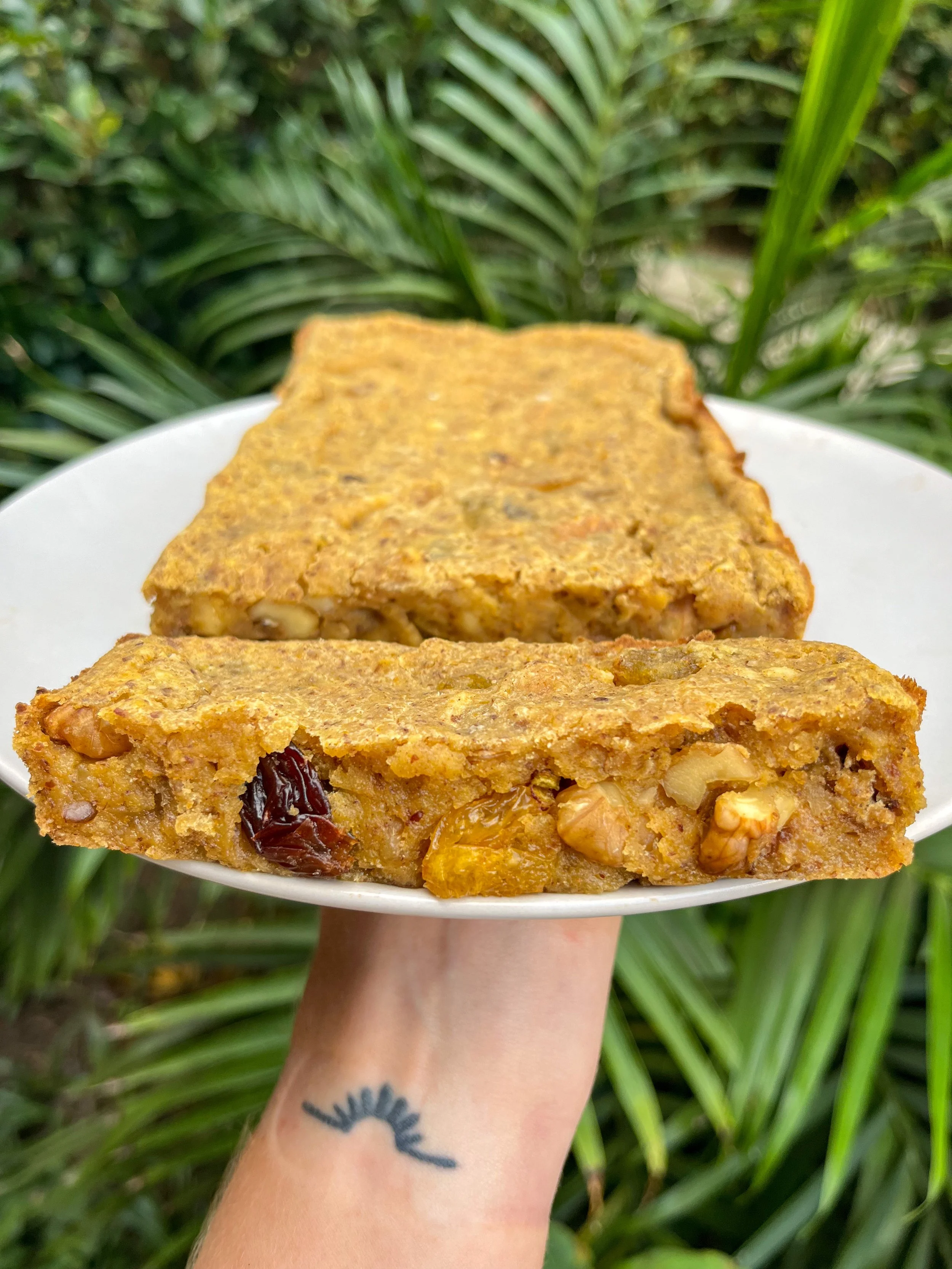 Spread across a small loaf pan and bake at 350 for 25-30 minutes or until knife comes out clean. Remove and let cool completely before slicing.